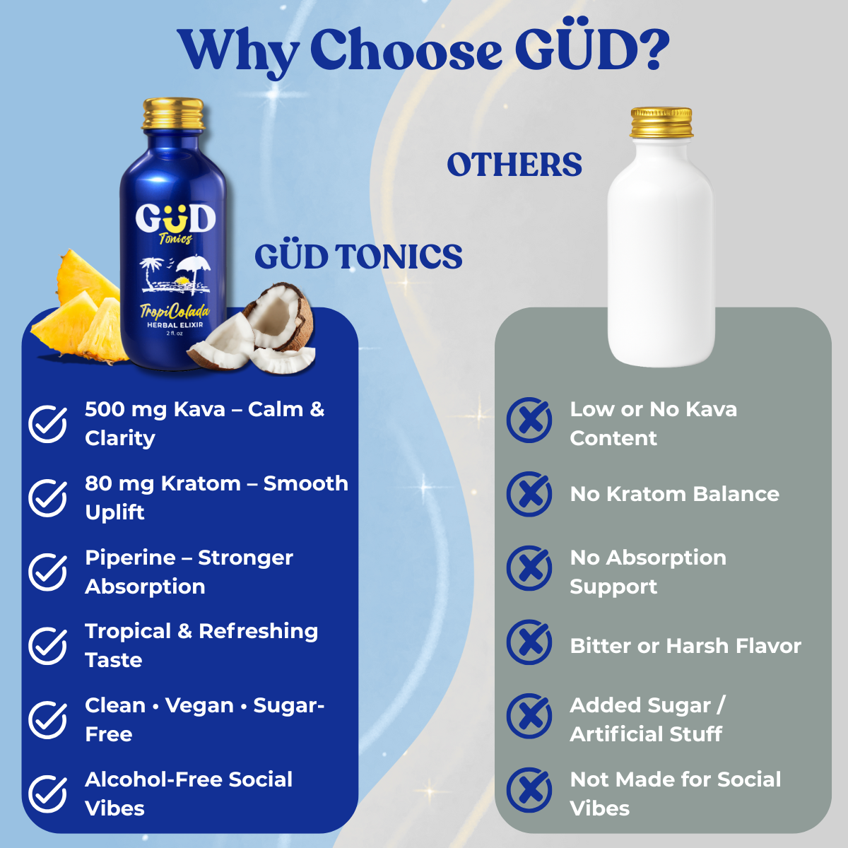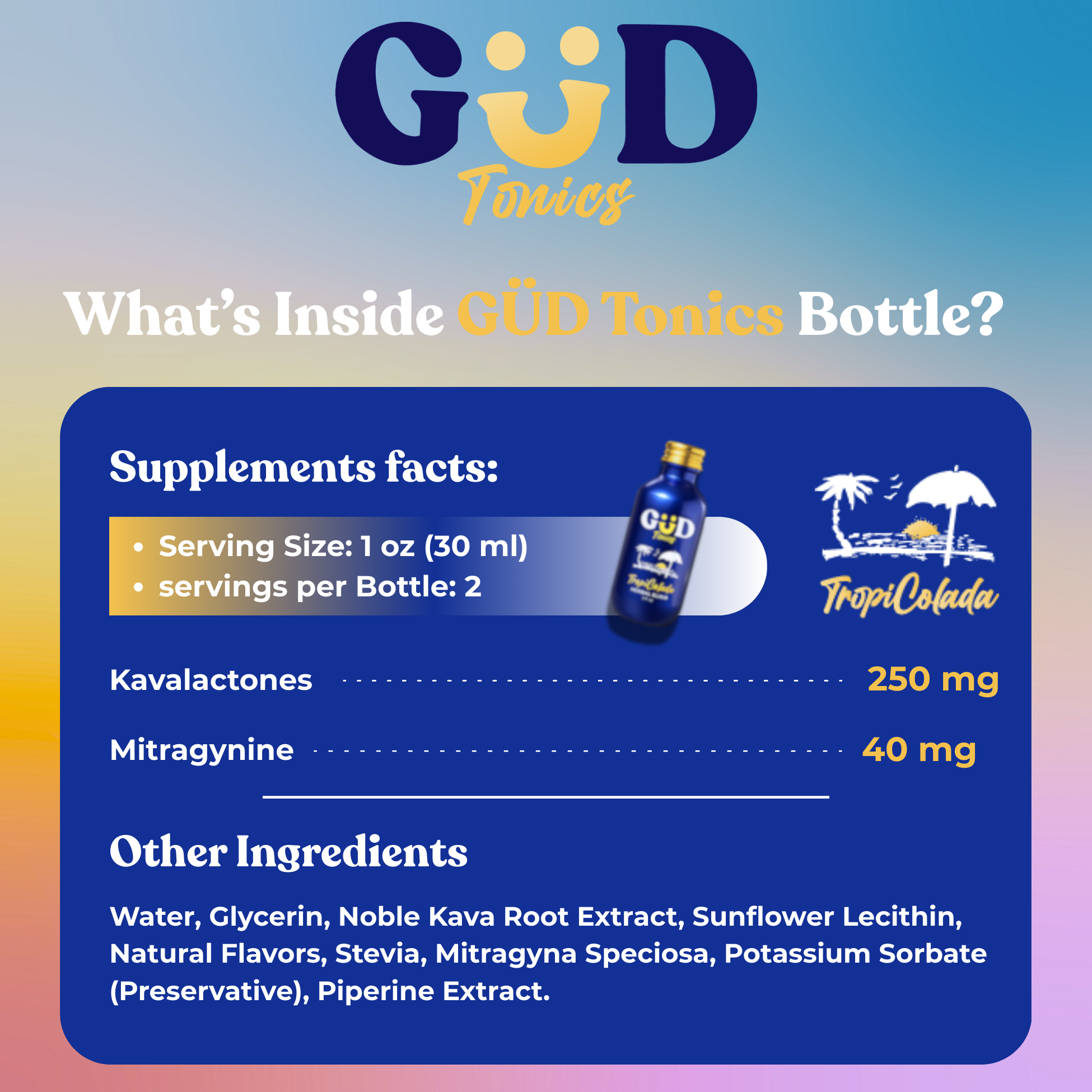 Maximize your relaxation with GÜD Tonics — now available in both a convenient 3-Pack and a value-packed 12-Box. Each bottle features our signature TropiColada flavor, infused with 500mg kavalactones and 80mg MIT for a smooth, balanced experience that helps you unwind, refocus, and recharge.